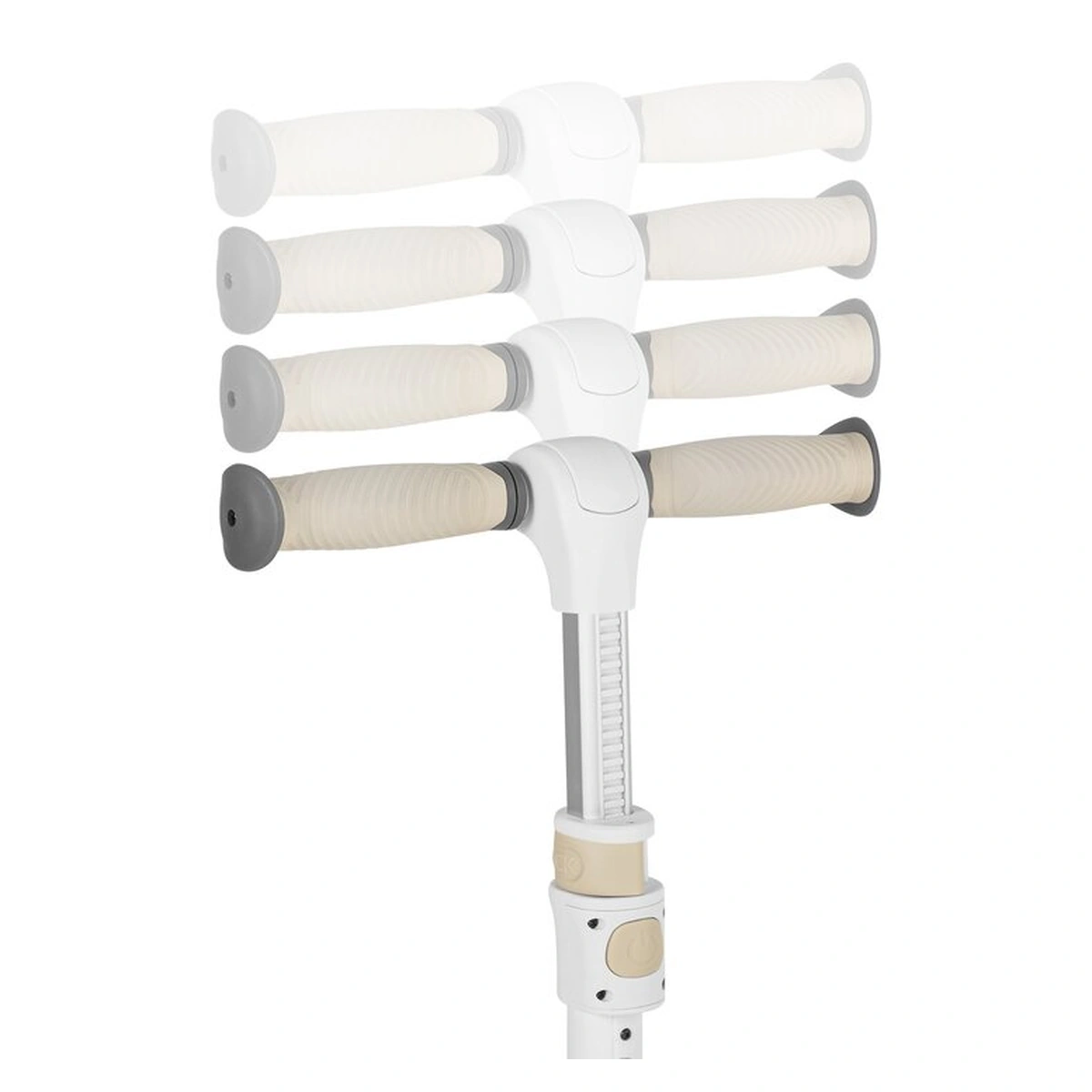 Inaltimea ghidonului poate fi reglata usor si infinit pe o gama larga. Aceasta functie asigura o ajustare precisa la inaltimea curenta a copilului. Astfel, produsul se potriveste atat copiilor mai mici, cat si celor mai mari, fie ca stau asezati sau in picioare.