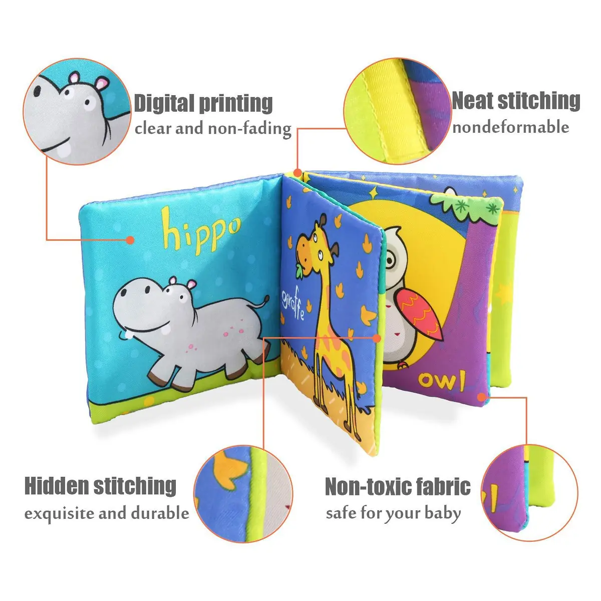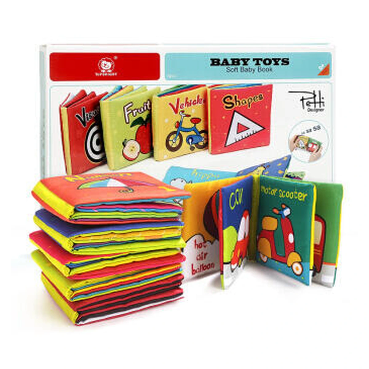 • fiecare carticica este prevazuta cu pagini care fosnesc si contine imagini si informatii despre numere, fructe, animalute, vehicule, forme